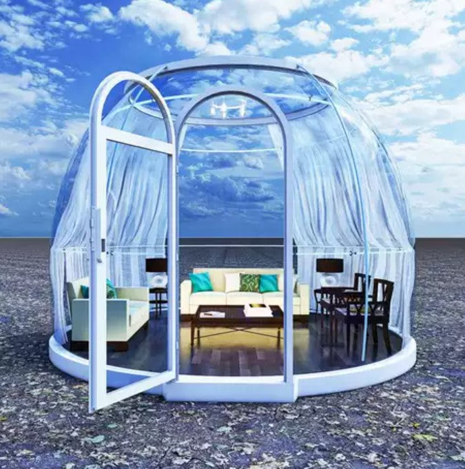 为您的庭院或商业场所增添奢华气质!这款 3.5米高透户外穹顶屋 采用 6063-T5 全新工业铝合金骨架 与 100% 德国进口 PC 透明板材,适用于后院休闲、户外餐饮、咖啡亭、冬季“玻璃屋”体验等多种场景。